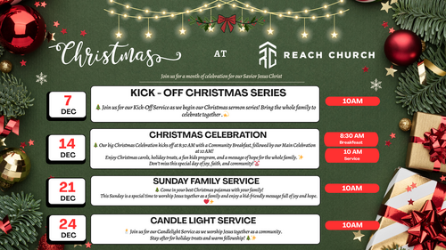 Celebrate the joy of the season with us at Reach Church all month long! 🌟 Every Sunday and throughout the week, we’ll gather for powerful services, fun activities, and meaningful moments designed to help you experience the true reason for Christmas—Jesus.